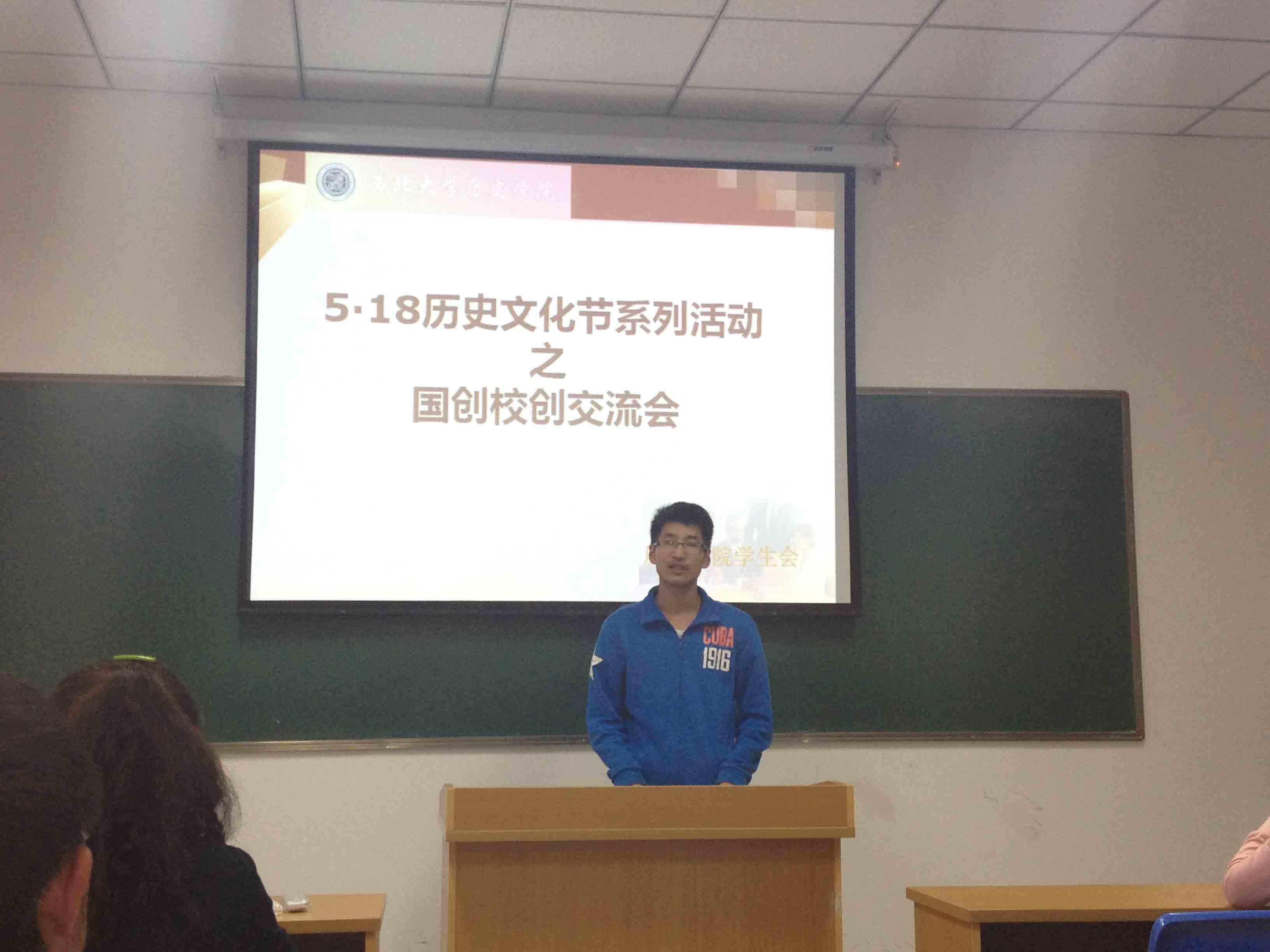 此次交流会不仅仅是历史文化节活动之一,也是院学生会从刚过去不久的国创、省创的申报与答辩中,吸取经验及教训,为众位有志在此方向深入研究的同学首次举办的交流活动。在交流会上,已经顺利完成国创项目的张庶学长、已申请到国创项目,正在进行中的李悦与党程程学姐和刚刚申请到省创项目的学姐学长们不仅向感兴趣的同学就自己如何选题、如何申请、如何选择小组成员与指导教师等方面的经历进行了详细的介绍,并分享了自己的经验与建议,而且,还耐心的对大家的提问做以回答。