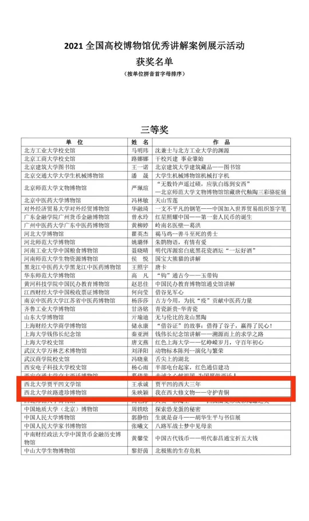 12月17日,第七届中国高校博物馆馆长论坛暨2021年全国高校博物馆优秀讲解案例推介展示发布仪式在北京广播大厦隆重举行。经过激烈角逐,我校博物馆选派的参赛选手、776net必赢官网2019级世界史专业本科生朱映颖同学讲解的《我在西大修文物—守护青铜》荣获三等奖和优秀创意奖。