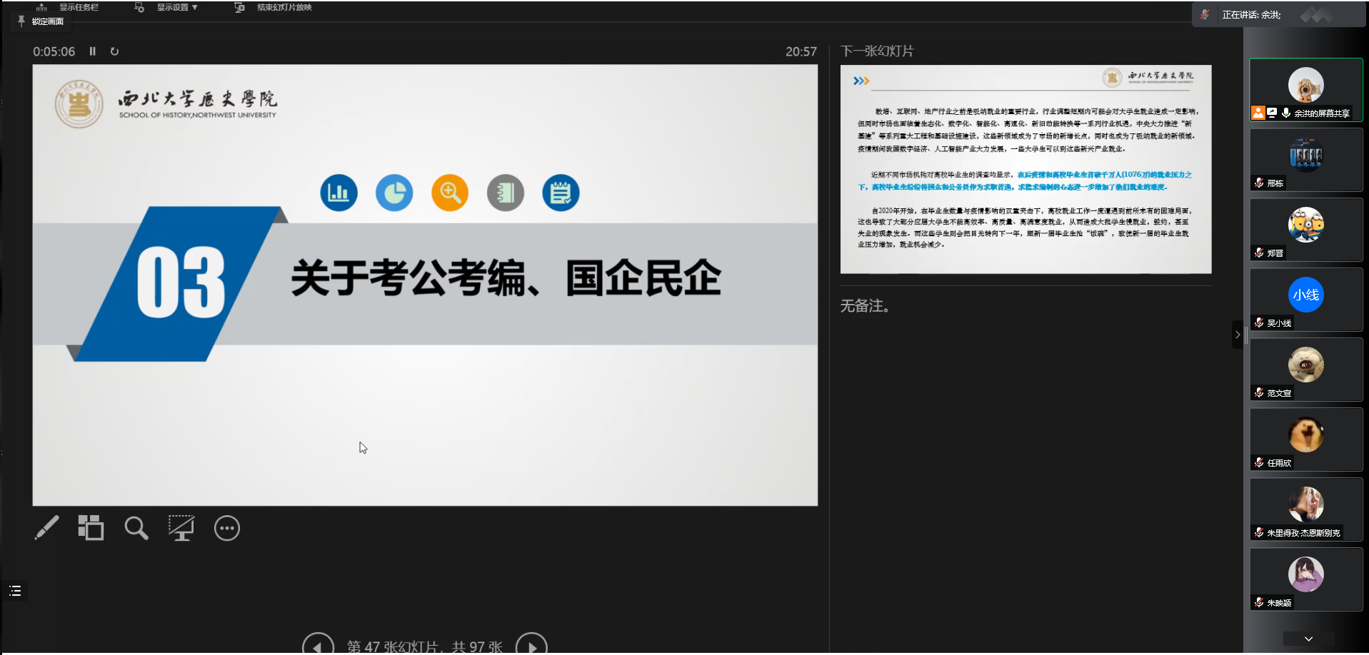 接着,余洪老师把视角转向同学们热衷的考公考编和国企民企专题,先通过详细的数据与相关政策文件为同学们讲解了公务员与选调生的政策要求,使同学们对公务员与选调生有了全面的认知。之后,余老师为同学们依次介绍了国企、央企、外企及私企的招聘情况与条件。
