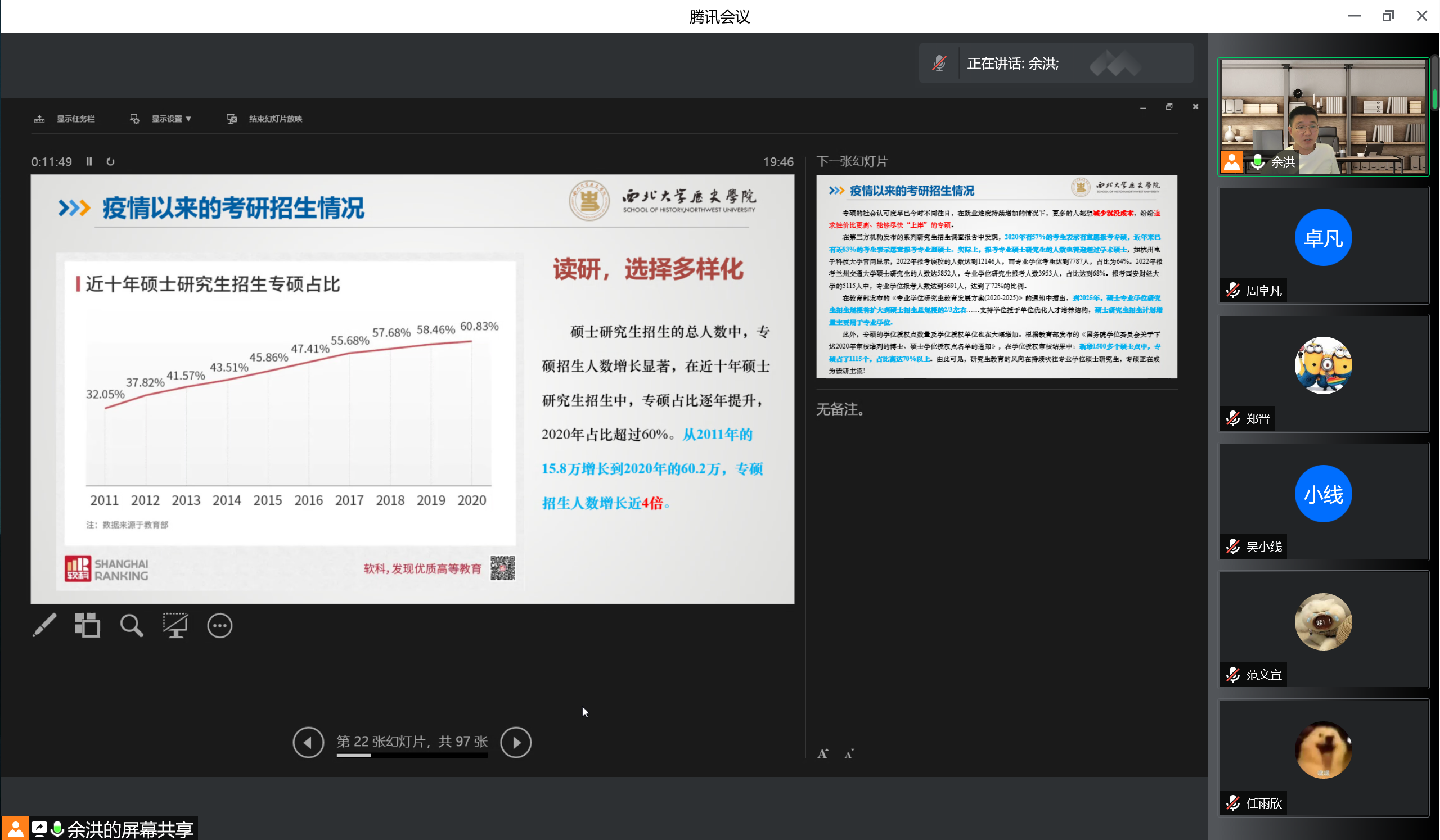 针对后疫情时代的就业大环境,余洪老师引用详实权威的数据信息,深入解读自新冠疫情发生以来的就业情况与研究生招生情况,建议同学们综合考虑,合理定位,明确目前考研与就业的形势、制定更加科学合理的个人未来规划。