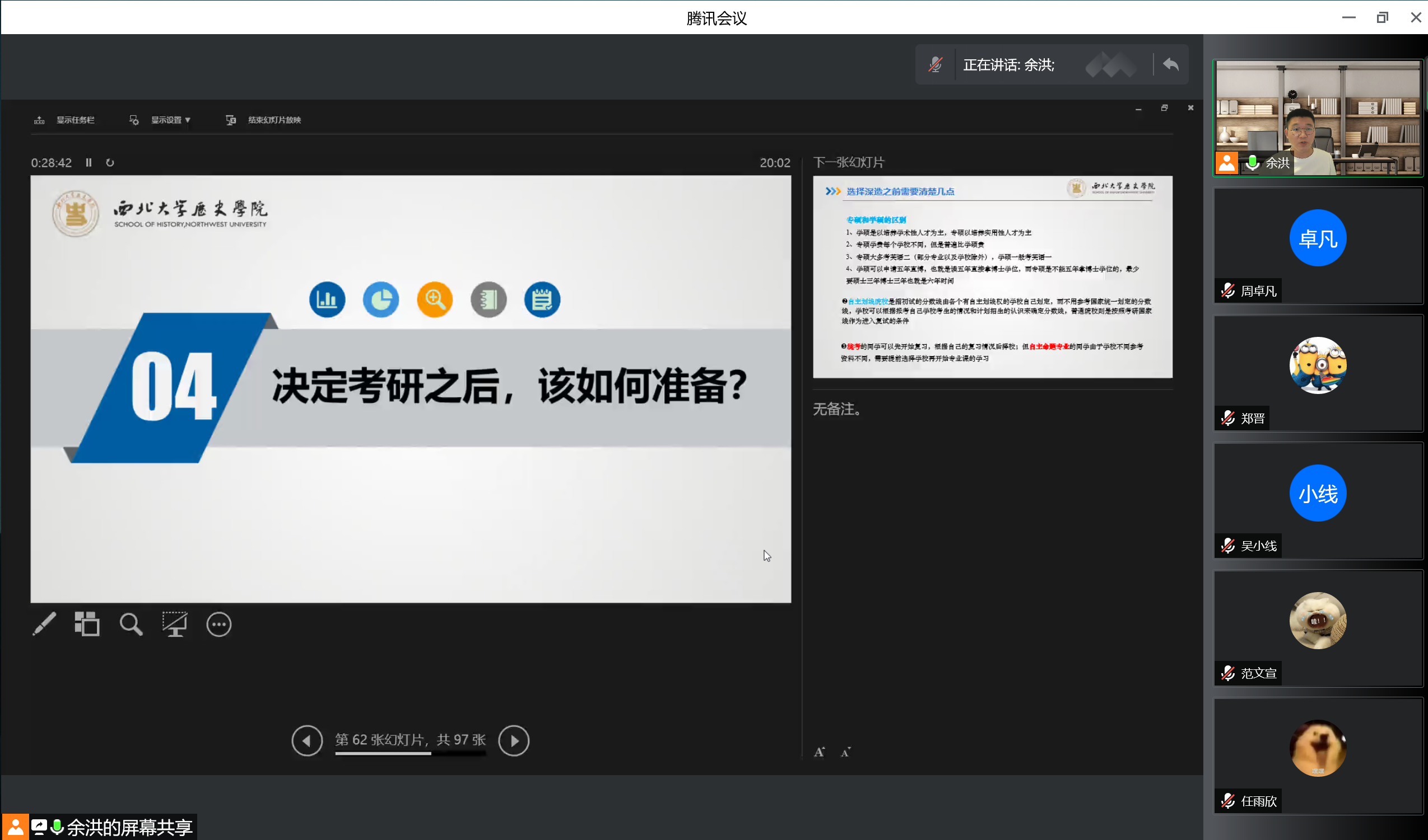 此外,余洪老师为大家详细介绍了决定考研后的备考思路。余老师建议同学们分五步进行备考:第一步,透彻理解考研最基本的通识信息,正确解读好国家的政策理念,先行确定考研大方向;第二步,明确自己的地域喜好与个人情怀;第三步,清晰权衡本人的综合实力,切忌只看院校专业排名;第四步,在确定地域及对自己做出综合判断后,多查询院校与专业信息;第五步,正式开始备考------合理选择,找准定位。随后,余老师还为同学们按照月份拆分了备考计划,深入浅出地指出了考研准备中容易忽略的问题,让同学们收获了满满“干货”。