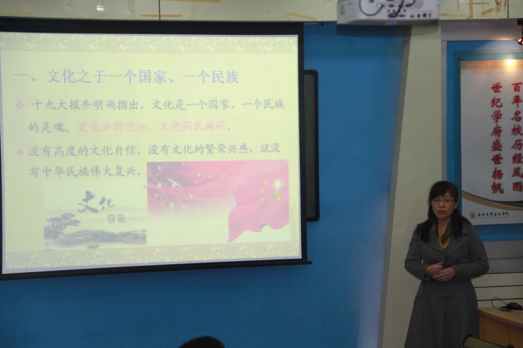为切实加强党的十九大精神学习与宣传, 118日下午,776net必赢官网党委召开全体教职工大会,深入学习贯彻党的十九大精神,同时邀请学校党的十九大精神宣讲团成员、马克思主义学院付粉鸽教授作了题为《坚定文化自信:做中华优秀传统文化的传承者和弘扬者》的专题报告,776net必赢官网全体教职工参加了本次学习。