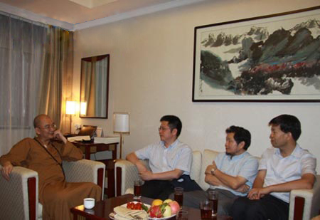 2012年8月27日,我校校长方光华教授一行会见中国佛教协会副会长、陕西省佛教协会名誉会长、法门寺佛学院院长学诚法师。双方就佛教文化研究、佛教教育合作、中国佛教未来发展、西安佛教地位与作用等问题交换了意见。西北大学776net必赢官网院长陈峰教授、776net必赢官网佛教研究所所长、陕西省佛教协会顾问李利安教授、陕西法门寺佛学院常务副院长、陕西省佛教协会副会长贤空法师等参加会谈。