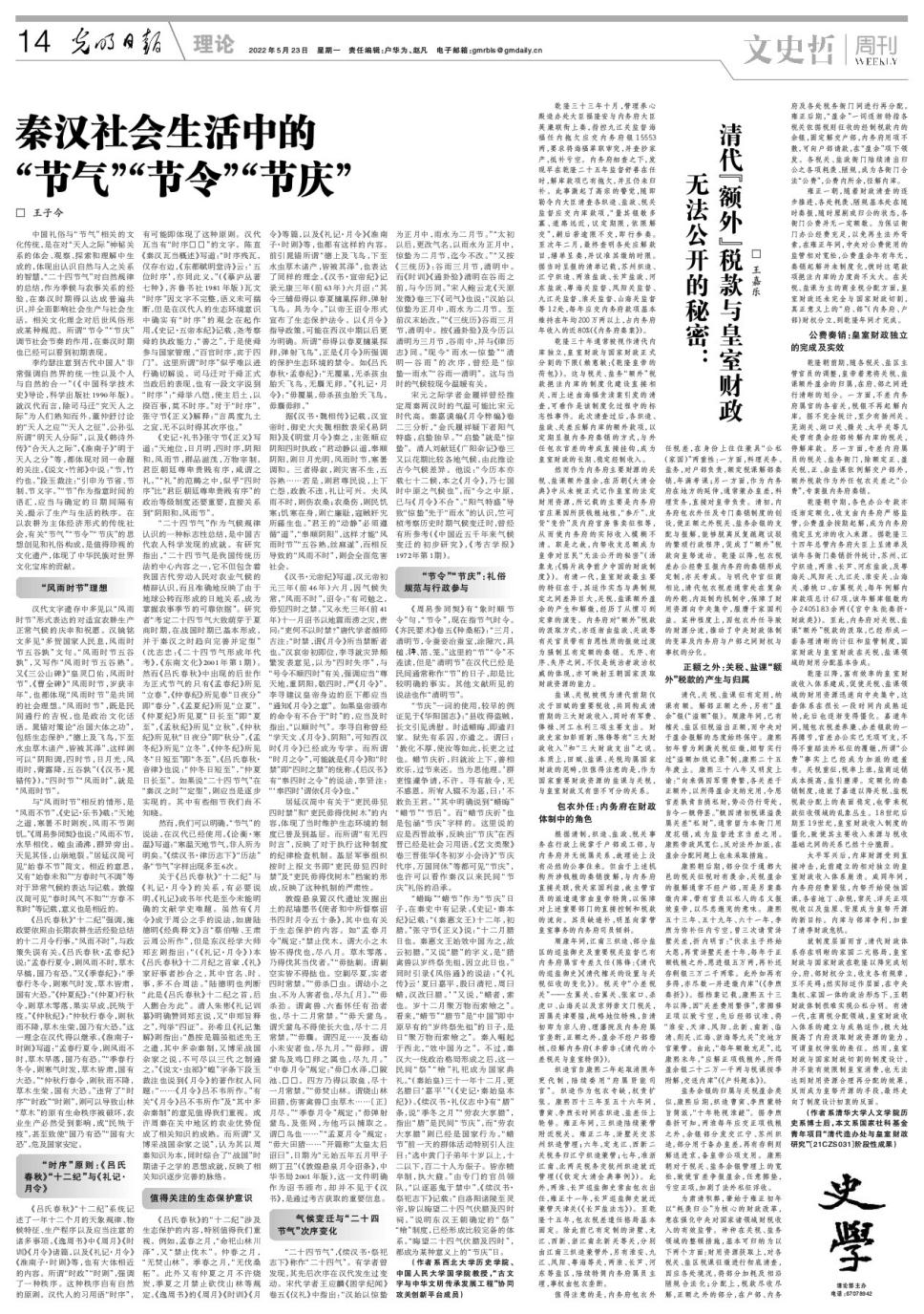 2022年5月23日,西北大学史学部主任、我院王子今教授在《光明日报·理论版》发表题为《秦汉社会生活中的“节气”“节令”“节庆”》的文章。
