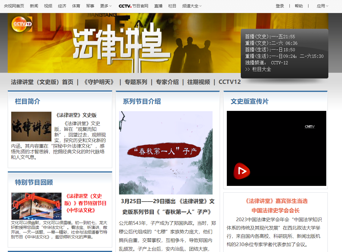 《法律讲堂(文史版)》是中央电视台“社会与法”频道的著名栏目,旨在“观复而知新”,回望过去,观照现实,探究历史和文化新的内涵。是一档弘扬法制精神、传播法律文化的讲座类节目融思想性、知识性、趣味性于一体,是具有学术根基、大众口味的法律文化普及课堂。