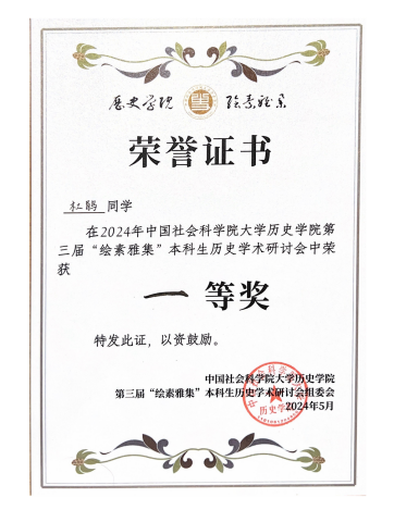 2024年5月31日,中国社会科学院大学第三届“绘素雅集”本科生历史学术研讨会在中国社会科学院大学良乡校区举办。我院2021级历史学(基地班)杜鹃同学应邀参加研讨会。