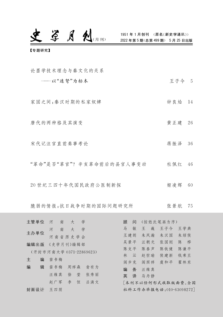 近日,我院王子今教授在权威期刊《史学月刊》2022年第5期发表题为《论墨学技术理念与秦文化的关系——以“连弩”为标本》的文章。