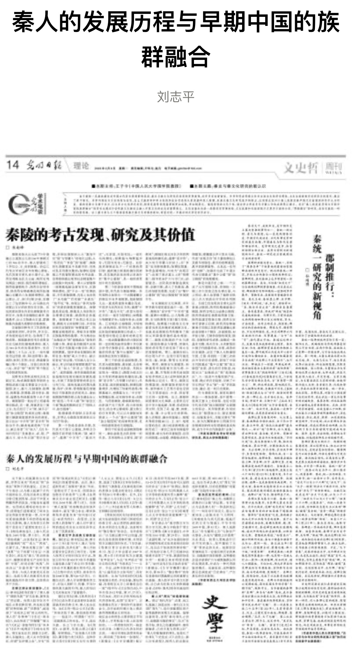 2023年2月6日,我院刘志平副教授在《光明日报·理论版》发表题为《秦人的发展历程与早期中国的族群融合》的文章。