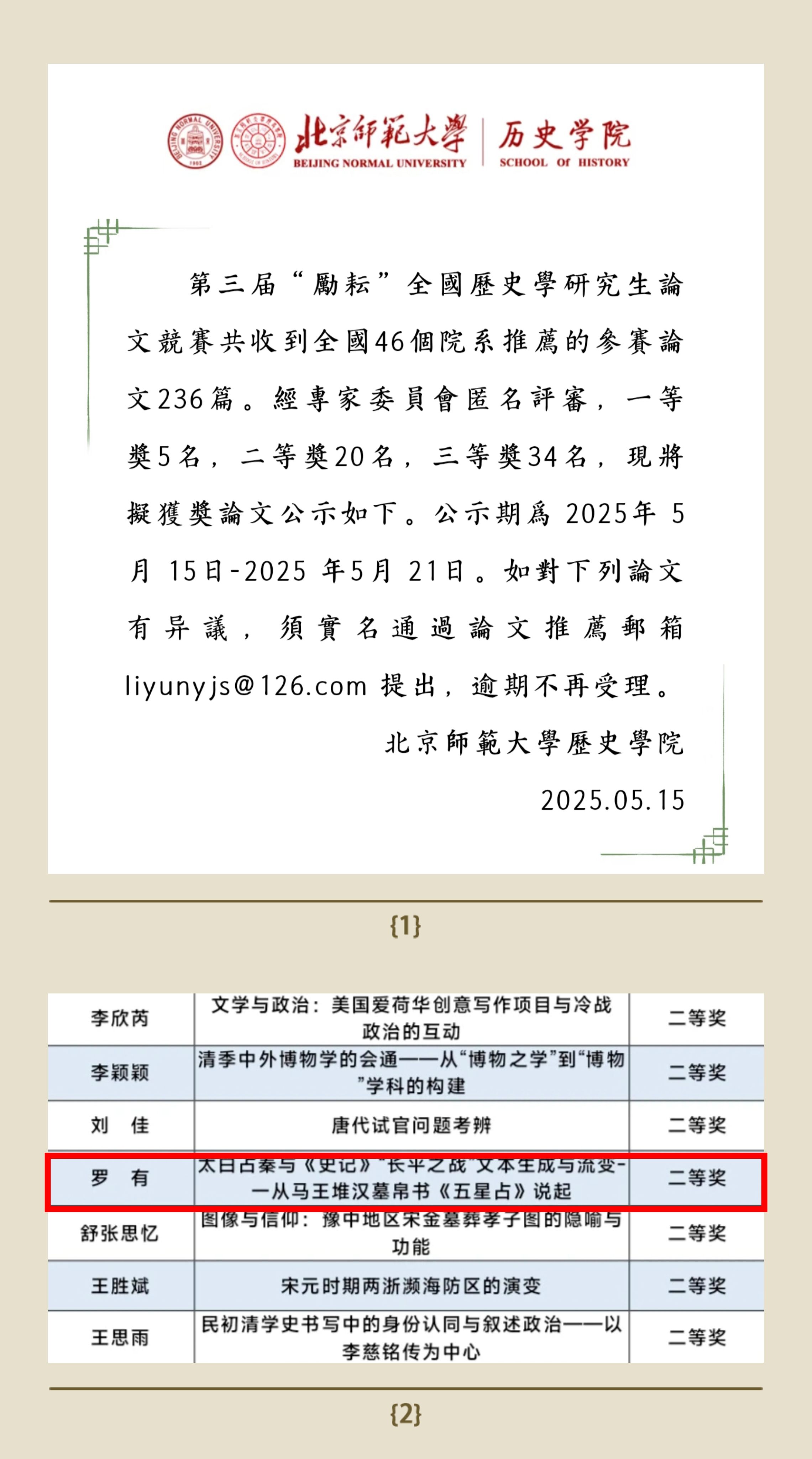 “励耘”全国历史学研究生论文竞赛是在教育部社会科学委员会历史学学部的大力支持与指导下举办的学术赛事。竞赛面向全国主要高校历史学科在读研究生,旨在推动历史学领域的学术交流与研究创新,激发学术活力。此次竞赛实行单位推荐制,参赛论文由各推荐单位按照一级学科博士点授予权单位推荐,硕士与博士研究生不分组。最终获奖名单将于《中国社会科学报》刊出。罗有同学的获奖论文深入探讨了《史记》中“长平之战”的文本生成及其背后的天文与文化象征,尤其关注了司马迁如何在史实与天人预言之间构建历史叙事。这篇论文的研究视角独特,跨越了天文学、文献学与文化史的多个学科领域,为先秦秦汉历史研究提供了新的思考模式与解释框架。